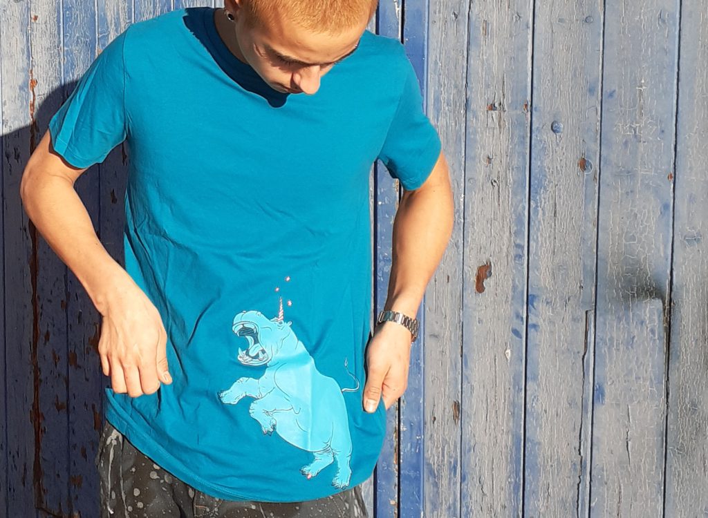 Die Shirts sind StanleyStella, ein von der Fair Wear Foundation kontrollierter Hersteller, und von Hand mit wasserbasierten Farben bedruckt.