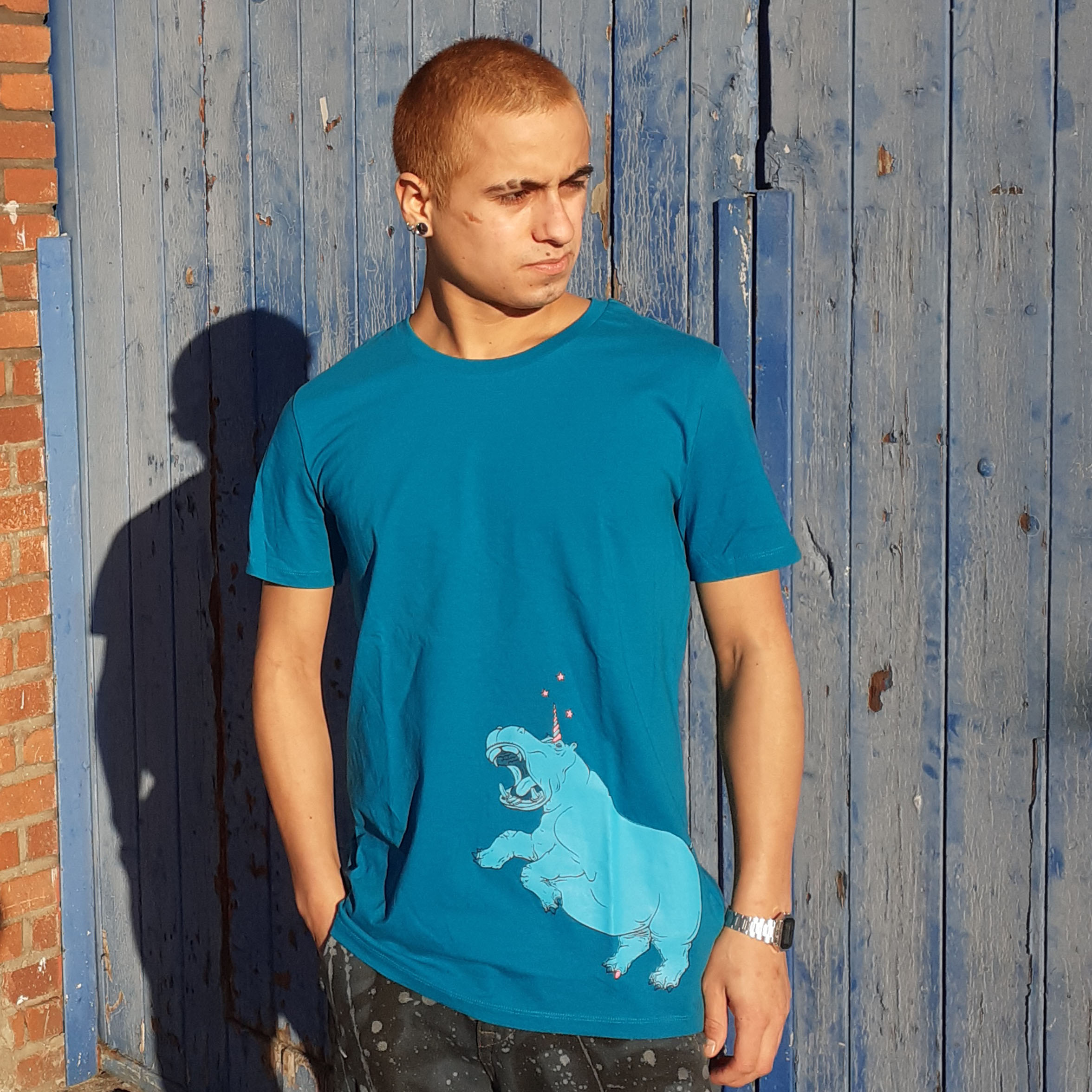 Die Shirts sind StanleyStella, ein von der Fair Wear Foundation kontrollierter Hersteller, und von Hand mit wasserbasierten Farben bedruckt.